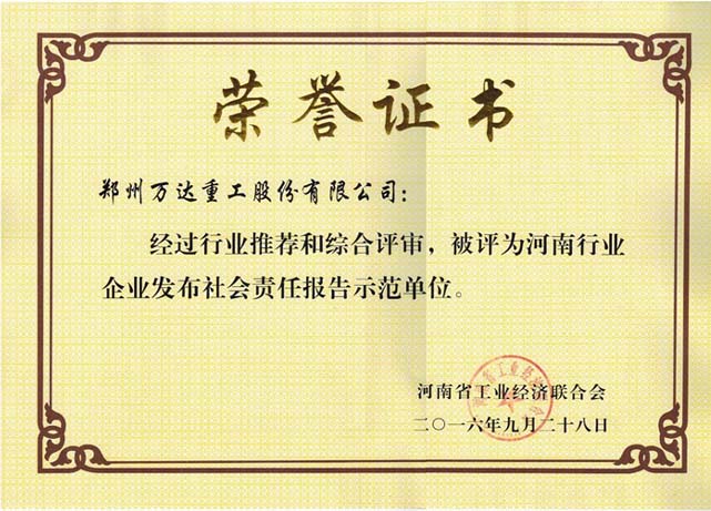 熱烈祝賀鄭州萬(wàn)達(dá)重工股份有限公司獲得“河南行業(yè)企業(yè)發(fā)布社會(huì)責(zé)任報(bào)告示范單位”榮譽(yù)稱