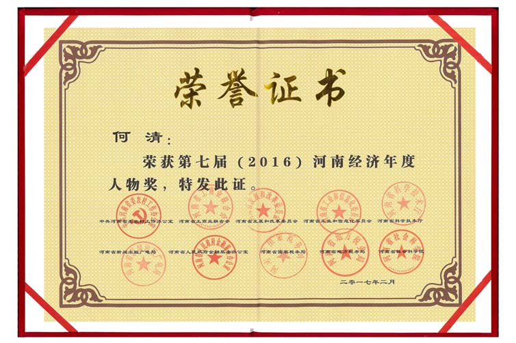 熱烈慶祝公司董事長書記何清先生榮獲 第七屆(2016)"河南經(jīng)濟年度人物"