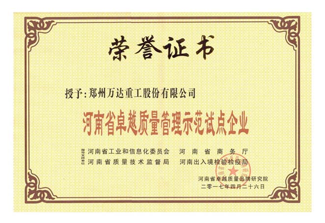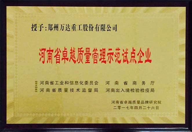熱烈祝賀鄭州萬達(dá)重工股份有限公司榮獲由河南省工業(yè)和信息化委員會、河南省商務(wù)廳、河南省質(zhì)量技術(shù)監(jiān)督局及河南出入境檢驗(yàn)檢疫局等單位共同指導(dǎo),河南省卓越質(zhì)量品牌研究院組織評選認(rèn)定的“河南省卓越質(zhì)量管理示范試點(diǎn)企業(yè)”榮譽(yù)稱號。