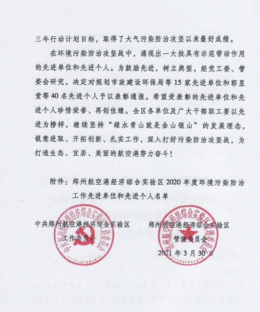 根據(jù)中共鄭州航空港經(jīng)濟綜合實驗區(qū)工作委員會文件 鄭港工委[2021]11號文《中共鄭州航空港經(jīng)濟綜合實驗區(qū)工作委員會 鄭州航空港經(jīng)濟綜合實驗區(qū)管理委員會關(guān)于2020年度環(huán)境污染防治工作先進單位和先進個人的通報》,萬達重工榮獲2020年度環(huán)境污染防治工作先進單位榮譽稱號。