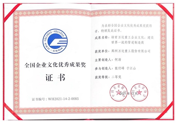 鄭州萬達(dá)重工股份有限公司以系統(tǒng)完善的企業(yè)文化體系及卓有成效的企業(yè)文化實(shí)踐,榮獲“2020-2021年度全國企業(yè)文化優(yōu)秀成果二等獎”!