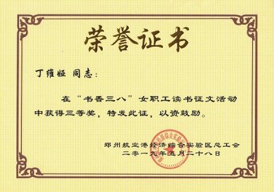 2019/06/11 667 5月28日,鄭州航空港經(jīng)濟(jì)綜合試驗(yàn)區(qū)總工會(huì)下發(fā)表彰通知,在全區(qū)女職工中開(kāi)展的逐夢(mèng)新時(shí)代巾幗綻芳華為主題的書(shū)香三八女職工讀書(shū)征文活動(dòng)中,我公司員工丁維婭的作品獲得三等獎(jiǎng),并下發(fā)榮譽(yù)證書(shū)及鄭州市新華書(shū)店購(gòu)書(shū)卡以資鼓勵(lì)。 為深入學(xué)習(xí)貫徹習(xí)近平新時(shí)代中國(guó)特色社會(huì)主義思想和黨的十九大精神,引導(dǎo)廣大女職工在閱讀中培育和踐行社會(huì)主義...
