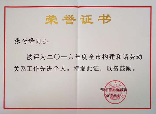 2017/06/28 675 熱烈祝 賀鄭州萬達(dá)重工股份有限公司總經(jīng)理張付峰同志被鄭州市人民政府評(píng)為2016年度鄭州市構(gòu)建和諧勞動(dòng)關(guān)系工作先進(jìn)個(gè)人。
