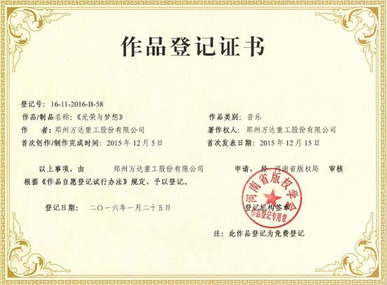 2016/03/04 402 熱烈祝賀鄭州萬(wàn)達(dá)重工股份有限公司司歌《光榮與夢(mèng)想》通過(guò)河南省版權(quán)局審核,并榮獲河南省版權(quán)局版權(quán)證書(shū)。