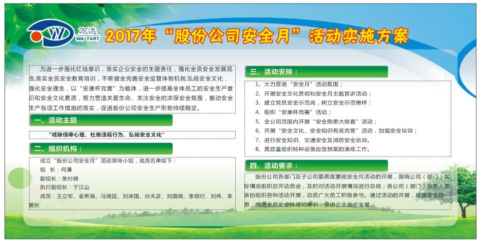 為進(jìn)一步加大安全生產(chǎn)宣傳力度,強(qiáng)化紅線意識(shí),推動(dòng)落實(shí)企業(yè)安全主題責(zé)任,弘揚(yáng)安全文化,強(qiáng)化安全理念,建設(shè)幸福萬(wàn)達(dá)事業(yè),公司特于2017年7月1日—7月31日舉辦以“戒除僥幸心理、杜絕違規(guī)行為、弘揚(yáng)安全文化”為主題的安全月活動(dòng)。