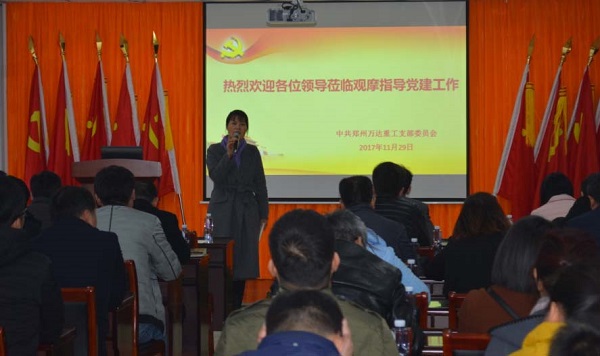 2017 年11 月29 日上午,實(shí)驗(yàn)區(qū)黨工委組織部組織區(qū)機(jī)關(guān)黨工委、各辦事處(IT 社區(qū))黨工委、興港公司黨委和港區(qū)7家非公企業(yè)黨建負(fù)責(zé)同志62 人蒞臨萬(wàn)達(dá)重工黨支部觀摩指導(dǎo)黨建工作。萬(wàn)達(dá)重工黨支部副書(shū)記于江山、紀(jì)律委員薛如勛、宣傳委員張夢(mèng)珠等人隨行陪同并講解企業(yè)運(yùn)營(yíng)、企業(yè)文化及黨建工作情況。