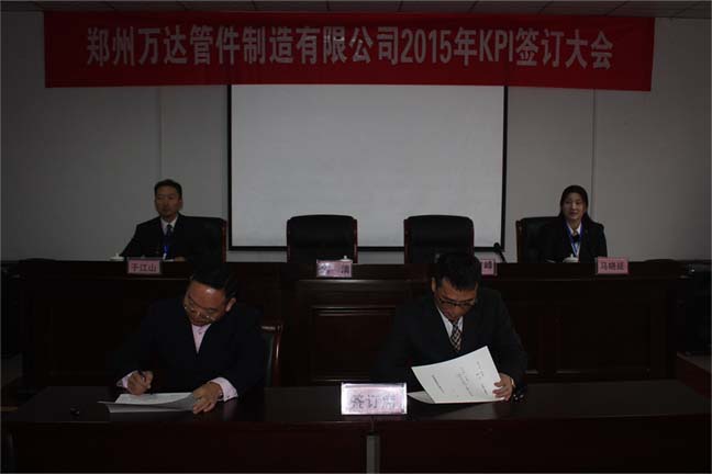 鄭州萬達(dá)管件制造有限公司2015年KPI簽訂會于1月30號在公司行政區(qū)會議室隆重舉行,公司班長以上所有管理人員參加了此次簽訂會議。簽訂會分為三級簽訂,即:董事長與總經(jīng)理簽訂、總經(jīng)理與公司各高管簽訂、公司各高管與分管的各部門負(fù)責(zé)人簽訂,近期,各部門負(fù)責(zé)人將部門的KPI指標(biāo)進(jìn)行分解,與各班組及相關(guān)崗位簽訂目標(biāo)責(zé)任書,達(dá)到“千斤重?fù)?dān)人人挑,人人肩上有指標(biāo)”的責(zé)任分解領(lǐng)受,確保最終順利完成公司2015年度各項任務(wù)和目標(biāo)。
