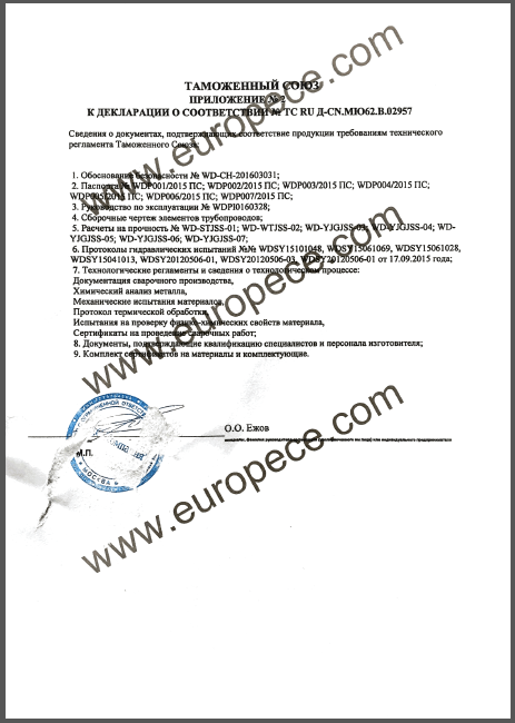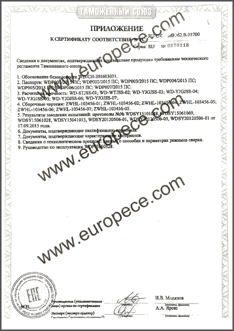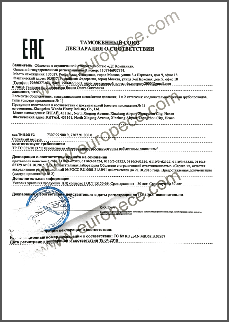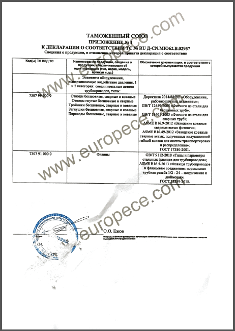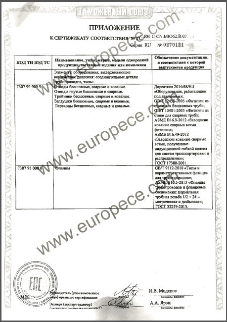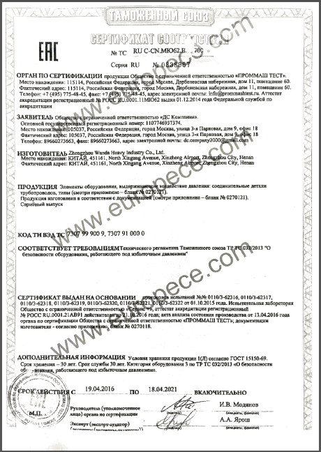 CU-TR認證產(chǎn)品覆蓋萬達重工生產(chǎn)的彎管、法蘭等各類型產(chǎn)品,認證證書的取得是俄白哈對萬達重工產(chǎn)品資料、安全標識、產(chǎn)品性能的肯定,同時驗證了萬達重工的產(chǎn)品質量又邁上了一個更高的臺階。近年來,我公司積極開拓海外市場,把擴大國際市場作為重要的發(fā)展戰(zhàn)略,此次CU-TR認證證書的取得,為我司進一步開拓歐洲市場提供了強有力的保證。