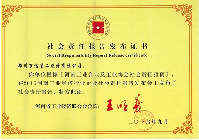 熱烈祝賀鄭州萬(wàn)達(dá)重工股份有限公司獲得“河南行業(yè)企業(yè)發(fā)布社會(huì)責(zé)任報(bào)告示范單位”榮譽(yù)稱