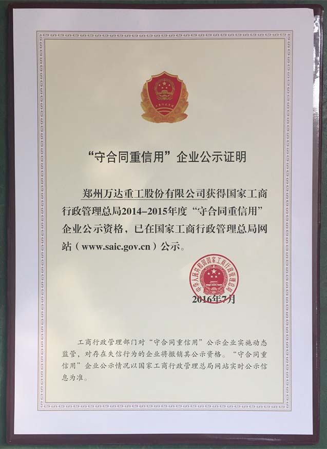 熱烈祝賀鄭州萬達(dá)重工股份有限公司榮獲2014-2015年度“國(guó)家守合同重信用”企業(yè)