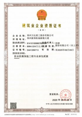 熱烈祝賀鄭州萬(wàn)達(dá)重工股份有限公司獲得《防水防腐保溫工程專(zhuān)業(yè)承包貳級(jí)資質(zhì)》