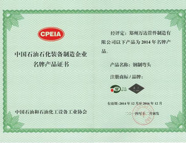 我司“益工”牌“鋼制彎頭”被評(píng)為“2014年中國(guó)石油石化裝備制造企業(yè)名牌產(chǎn)品”